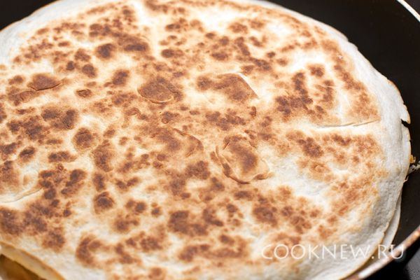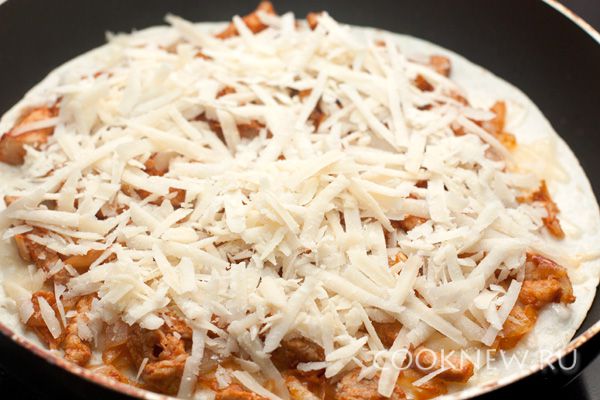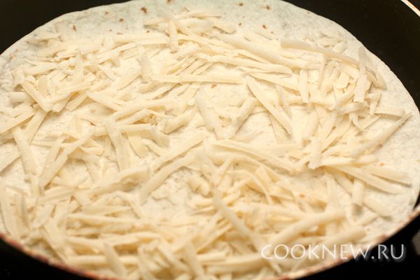 Сыр натрите на крупной терке. Это может быть чеддер, пармезан, гауда или другой твердый или полутвердый сыр. Одну тортилью положите на горячую сухую сковороду, посыпьте ее слоем сыра