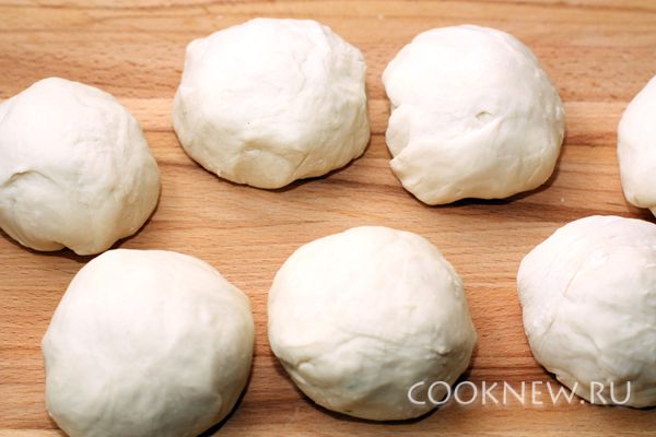 Из теста сделайте 6-8 одинаковых шариков (примерно по 130-140 г. Используйте муку для подсыпки, при необходимости. Опять накройте шарики полотенцем и оставьте на 10 минут