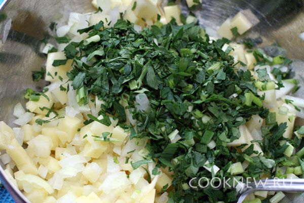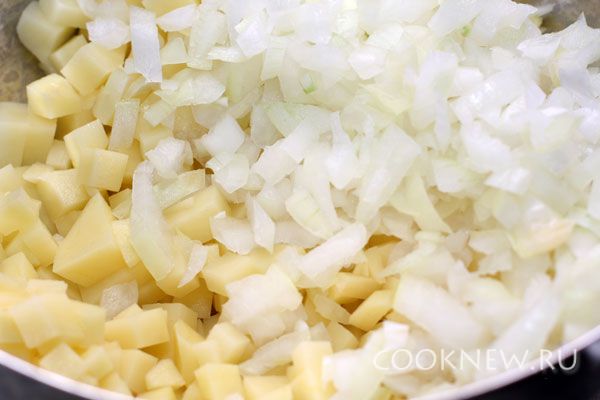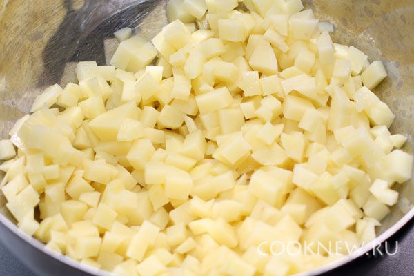 Пока тесто доходит, сделайте начинку. Картошку очистите и нарежьте очень мелкими кубиками