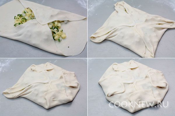 Шарики теста раскатайте поочередно тонким слоем, в центр положите начинку (1-2 столовых ложки) и сверните, как показано на картинке. Чтобы тесто лучше склеивалось, можно слегка смочить его водой
