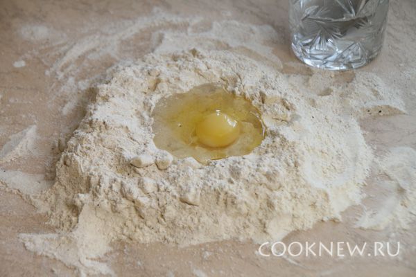 На рабочую поверхность просейте оба вида муки, добавьте сливочное масло и покрошите его ножом. Сделайте углубление, в него вбейте яйцо и добавьте две столовые ложки ледяной воды. Аккуратно замесите тесто