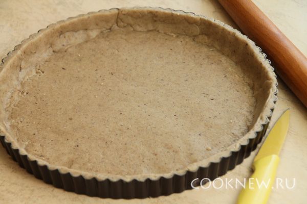 Раскатайте тесто по размеру дна формы, из остатков сделайте бортики. В таком виде тесто с формой убираем в холодильник на 1 час