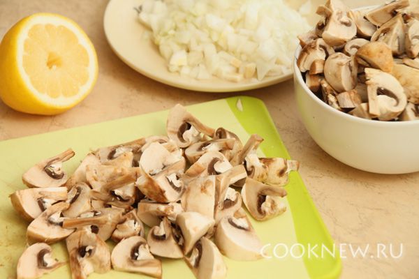 займёмся приготовлением начинки. Порежьте маленькими кубиками сало, мелко порубите лук, а грибы нарежьте дольками. Сбрызните грибы лимонным соком