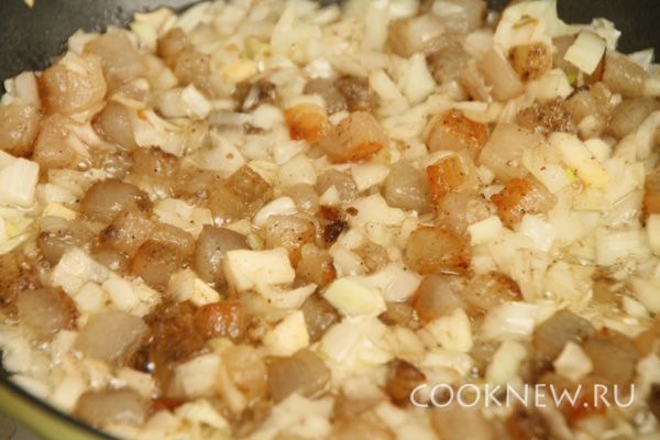 Сало обжарьте на сковороде, затем добавьте лук и обжаривайте его до прозрачности