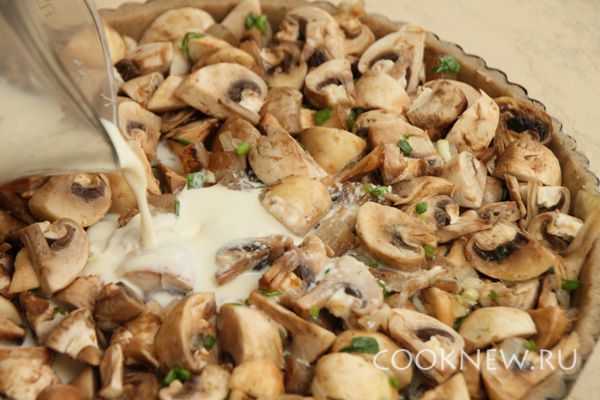Зелёный лук мелко порежьте, смешайте с шампиньонами и обжаренным салом с луком. Положите начинку в форму и залейте соусом. Для этого перемешайте яйца со сливками, солью и тёртым сыром