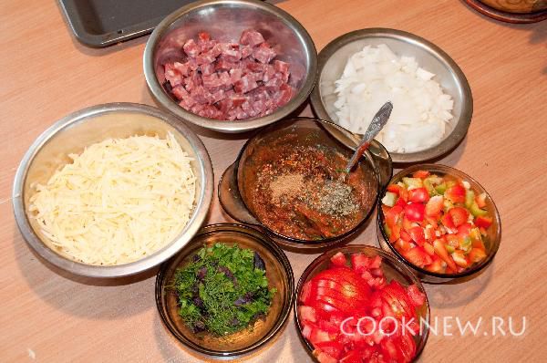 Пока стоит тесто, крошите начинку-лук, перец болгарский, помидоров парочку, зелень (укроп, базилик), сыр, колбаса