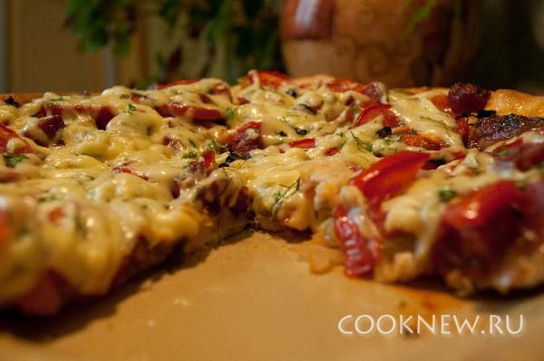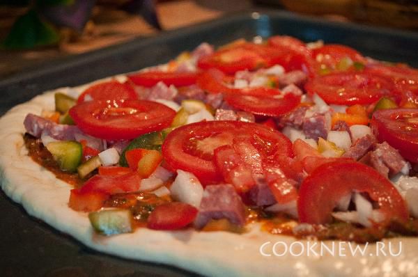 За время чистки и приготовления овощей тесто должно было подойти, его нужно достать и раскатать на листе (не забывайте разделить на 2 части для1ой и 2ой пиццы). Сверху смазать смесью для основы.Выложить приготовленные овощи и колбасу.