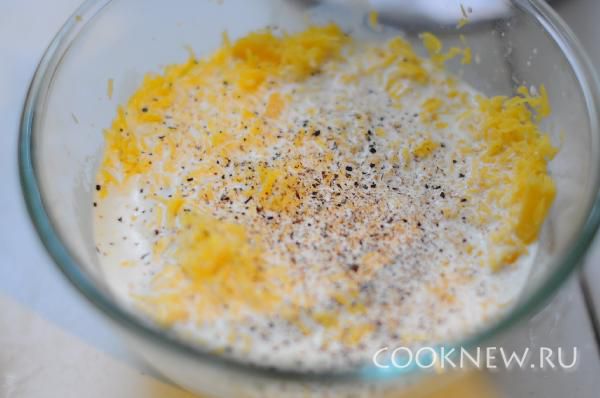 Оставляем тесто на некоторое время, чтобы заняться начинкой. Нужно потереть на мелкой терке сыр и смешать со сливками, поперчить. Сыр может быть любой