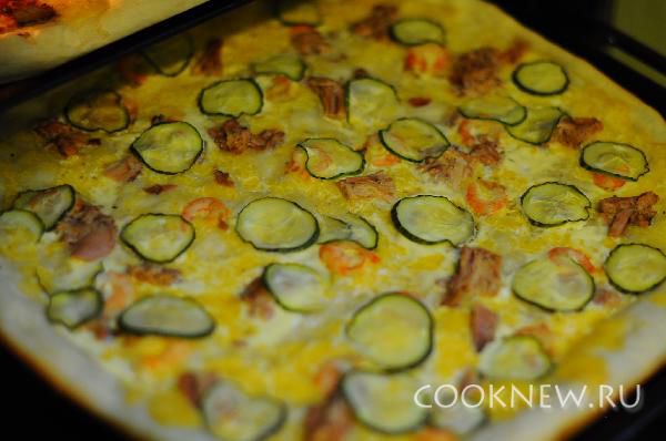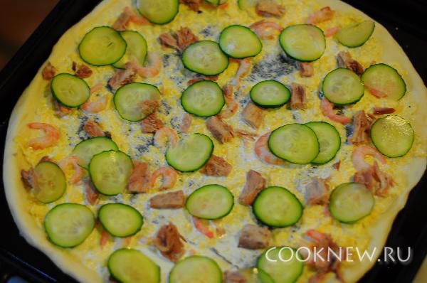 Смазать противень маслом, раскатать или разровнять тесто на противне в форме круга или в любой произвольной форме. На тесто положить пару листов нори, чтобы они заняли всю поверхность. Сверху половина соуса из сыра и сливок, полбанки тунца в собственном соку, слив предварительно жидкость, половину порции креветок и половину порции огурцов. Вторую пиццу сделать аналогично