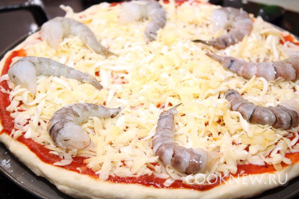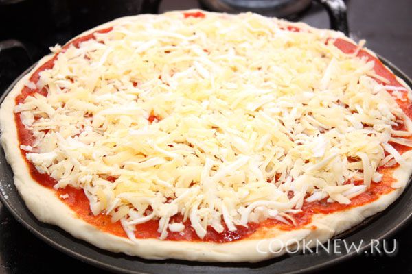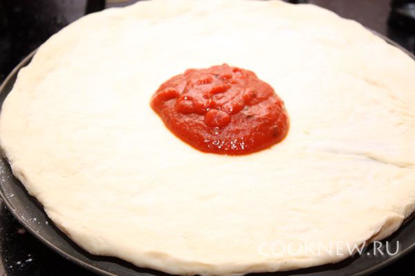 После второго подъема можно приступать к приготовлению пиццы. Тесто раскатать (или понемногу растянуть) до размера формы, в которой вы будете готовить. Толщина теста должна быть примерно 0,5-1 см. Это зависит от того, какую основу вы предпочитаете — потолще или потоньше. На тесто выложить томатный соус для пиццы и равномерно распределить его по основе