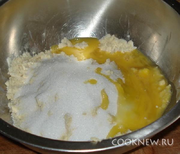 Добавляем сахар, яйцо, перемешиваем. Ставим в холодильник на 1 час