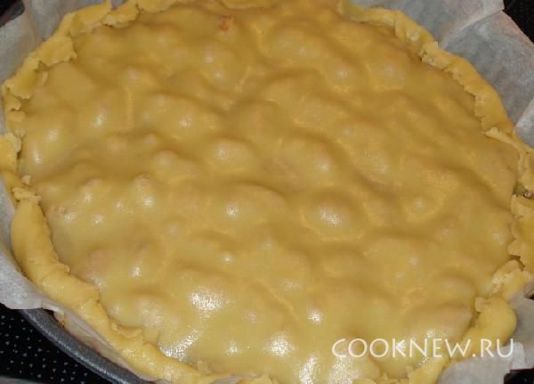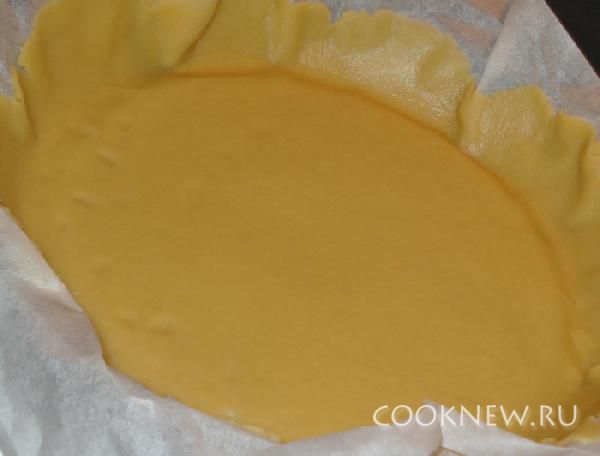 Тесто делим на 2 части( 1 часть чуть больше второй. Раскатывем толщиной 3 мм.1 часть кладем в форму на пергамент