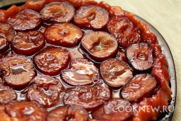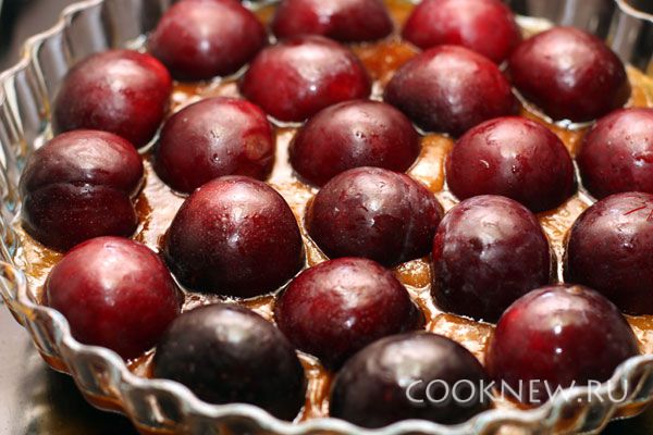 Сразу же перелейте карамель в форму для пирога и разложите сверху половинки слив
