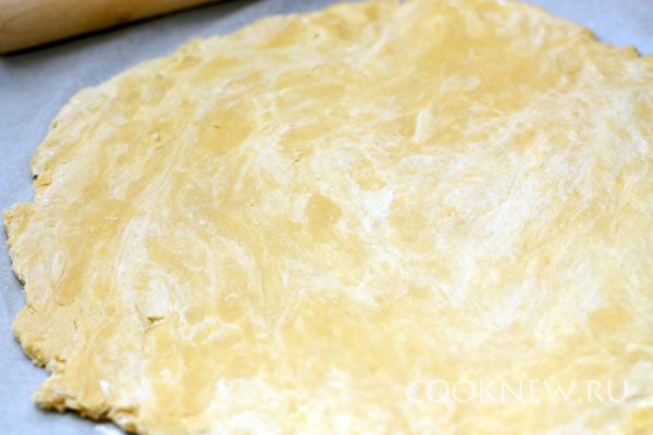 Раскатайте тесто слоем в 5 мм на бумаге для выпечки и уберите в холодильник на 30-40 минут