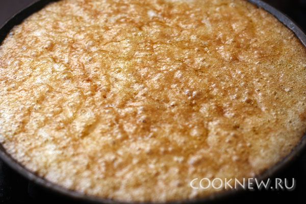 Выпекайте в разогретой духовке при 190 градусах 35-40 минут. Достав пирог, дайте ему немного остыть, а затем накройте тарелкой и переверните вместе с ней, чтобы пирог оказался на тарелке