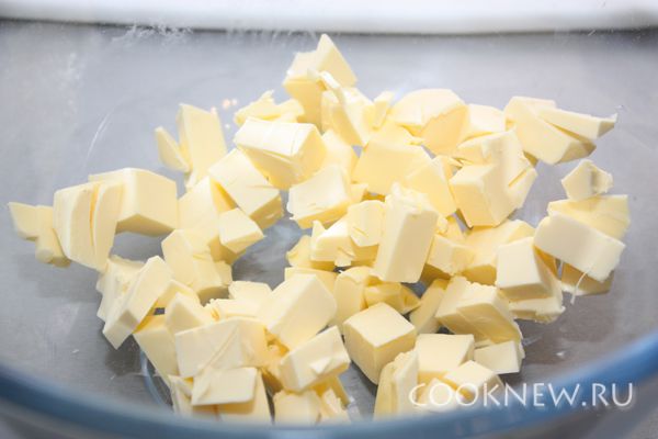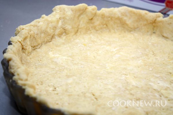 Холодное тесто раскатываем слоем около 0,5 см так, чтобы получился большой блин (больше размера формы для выпечки) и выстилаем им форму для выпечки. Форму с тестом можно еще разок поставить в холодильник минут на 20