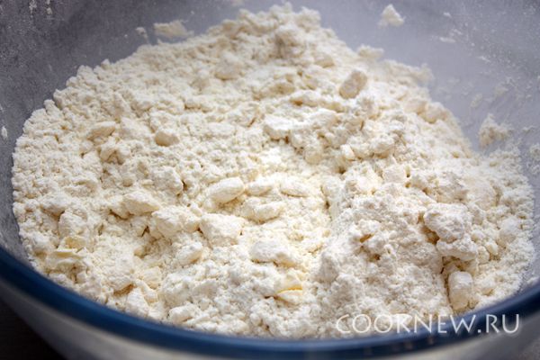Добавить просеянную муку и сахар, порубить до состояния крошки