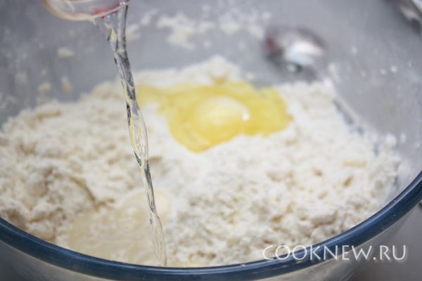 Положить в тесто одно яйцо и 2 столовых ложки ледяной воды. Для аромата лучше заменить воду крепким алкоголем — ромом или коньяком