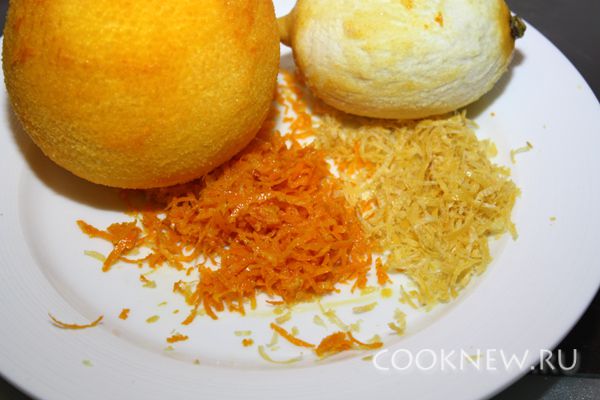 Теперь займемся начинкой. С одного апельсина и одного лимона снимем цедру с помощью мелкой терки. Из всех цитрусовых выжмем сок