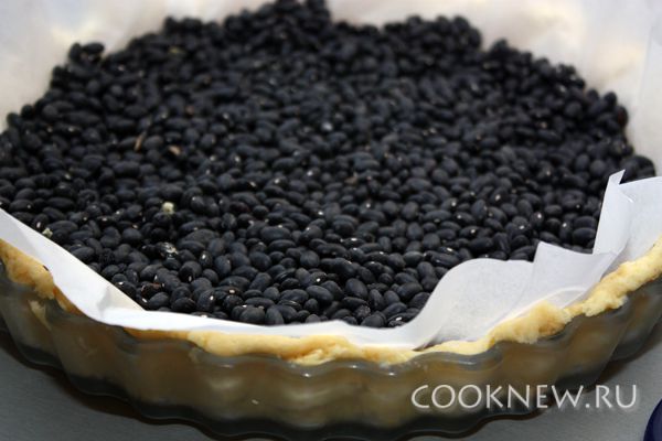 Тесто накалываем вилкой в нескольких местах, сверху кладем бумагу для выпечки и насыпаем фасоль, горох или шарики для выпечки. Ставим в духовку на 15 минут при 190-200 градусах (для того, чтобы тесто не поднималось)