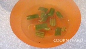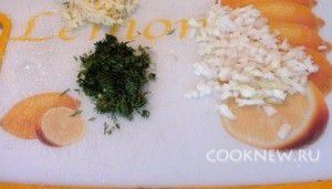 А пока порежем зелень, лук и раздавим 3 дольки чеснока через пресс