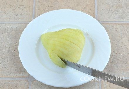 Груши очистить от кожуры, разрезать каждую пополам и вырезать несъедобную часть.