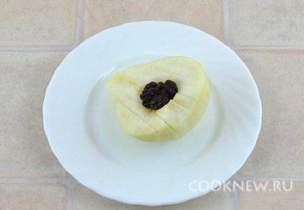 Перевернуть, внутрь положить изюм (его предварительно хорошо помыть в горячей воде)