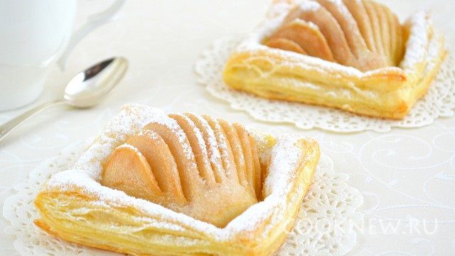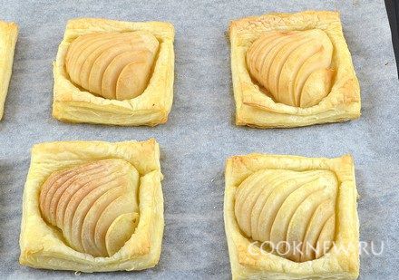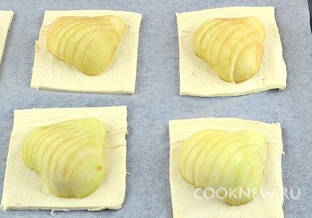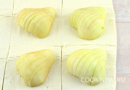 Тесто разморозить, развернуть, раскатывать не нужно. Выложить половинки груш наискосок на расстоянии друг от друга. Порезать слоеное тесто на квадраты таким образом, чтобы каждая половинка груши лежала на своем квадрате.