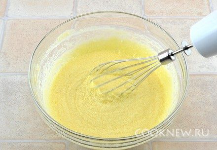 Добавить разрыхлитель и муку частями, каждый раз взбивая миксером