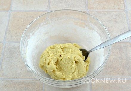 Добавить разрыхлитель, муку, вымешать тесто. Тесто получается довольно плотное, но пластичное