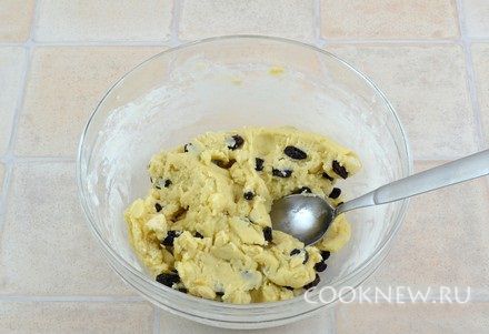 Добавить изюм и миндаль, равномерно вмешать в тесто.