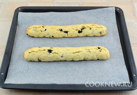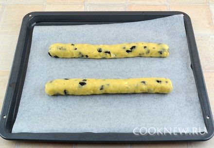 На противень постелить пекарскую бумагу. Разделить тесто пополам, из каждой части скатать колбаску длиной примерно 30 см. Выложить на противень и поставить в разогретую до 180 градусов духовку. Выпекать 25 минут.