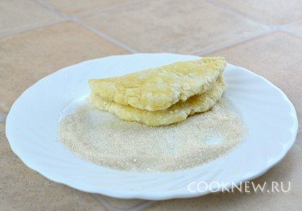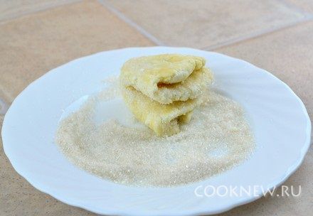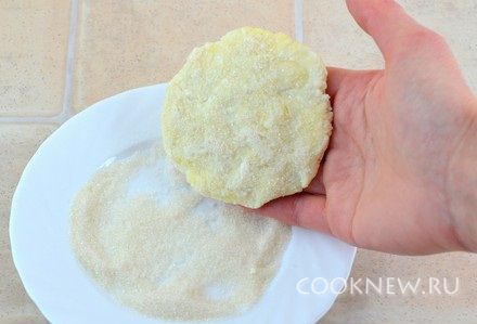 Разделить тесто на 12 шариков, сахар насыпать в плоскую тарелку. Шарик расплющить в руках в плоскую лепешку, положить в сахар, слегка придавить