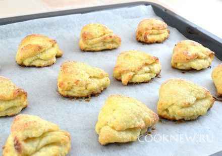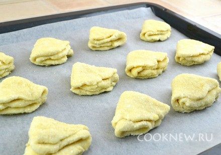 Противень застелить пекарской бумагой. Выложить готовые ушки сахаром вверх.
