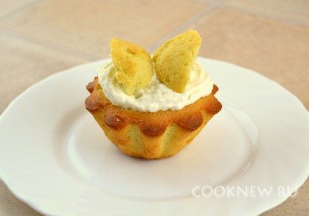 Выдавить из шприца сливки на поверхность кекса. Сверху поставить половинки срезанной верхушки в виде крыльев.