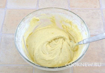 Добавить разрыхлитель и бóльшую часть муки, немного взбить