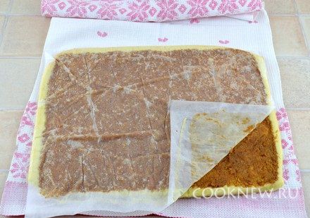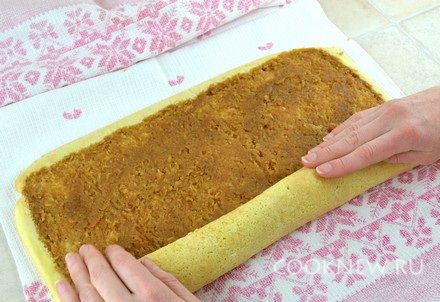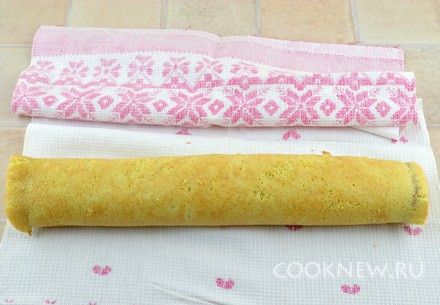 Свернуть горячий корж в плотный рулет (сначала помогая себе полотенцем)