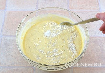 Всыпать просеянную муку, вымешать ложкой по кругу