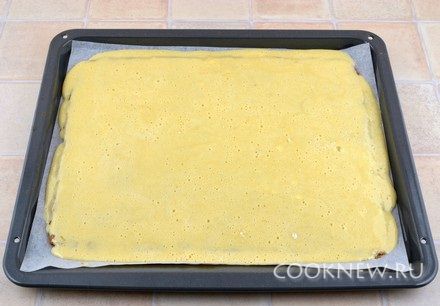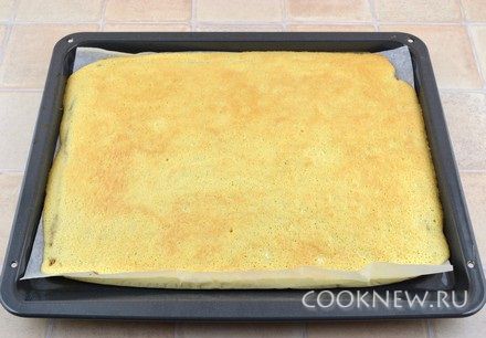 Готовый корж сразу перевернуть на чистое кухонное полотенце. Аккуратно отделить пергаментную бумагу