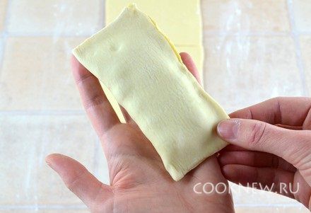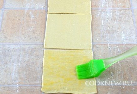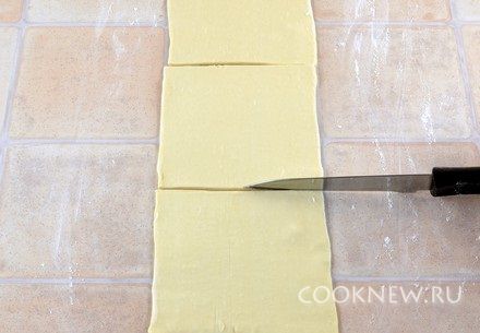 Рабочую поверхность немного посыпать мукой. Раскатать тесто в длину до 2-3 мм по толщине (раскатывать в одном направлении). Порезать на квадраты со стороной 10 см.