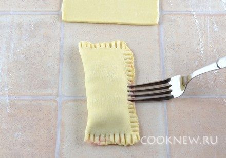 С помощью вилки по краю слойки сделать узор, который также дополнительно склеит тесто.