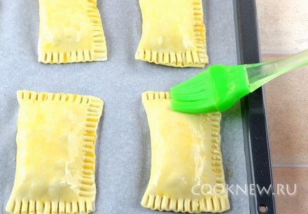 Выложить на противень, застеленный пекарской бумагой. Смазать взбитым яйцом. Поставить в разогретую до 200 градусов духовку. Выпекать примерно 20-25 минут.