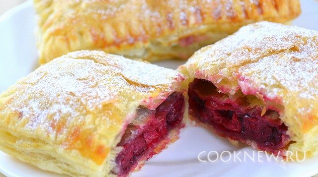 На одну половину квадрата выложить вишню, немного посыпать крахмалом