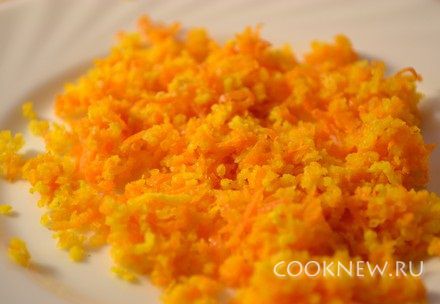 Счистить цедру апельсина, для чего поверхность апельсина натереть на мелкой терке (только оранжевую часть, не затрагивая белый слой).