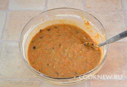 Добавить растительное масло, морковь, изюм, цедру, корицу, мускатный орех и разрыхлитель (или гашеную соду). Перемешать.