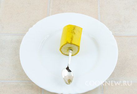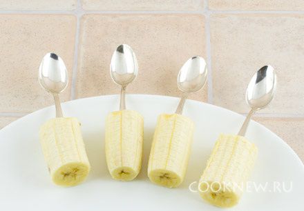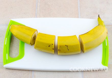 Банан, не очищая, разрезать на 4 части (или на 2-3 части, если банан не длинный)