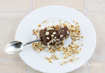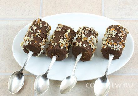 Сразу же обвалять его в орехах. Так как банан холодный, то шоколад застывает очень быстро и нужно действовать оперативно, чтобы орехи успели прилипнуть.
