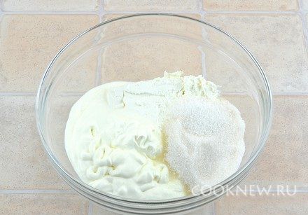 Творог, сметану, сахар ( 70 гр ), ванильный сахар положить в одну емкость.