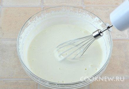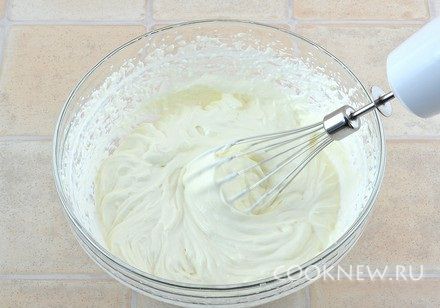 Влить остывший желатин в творожную массу, одновременно взбивая миксером. Взбить еще в течение минуты.