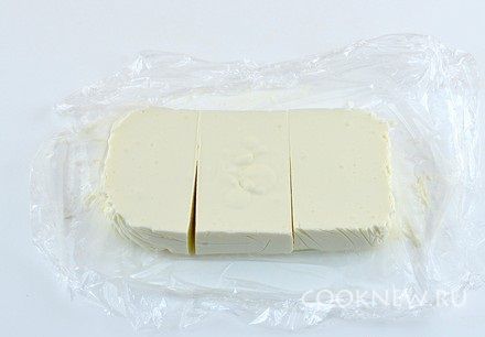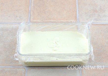 Подготовить небольшой судок или другую прямоугольную форму. Смазать ее тонким слоем сливочного масла (это нужно, чтобы прилипла пленка), выстелить пищевой пленкой. Выстеленную пленку также немного смазать маслом (это чтобы легко отделился готовый десерт). Вылить в форму творожную массу, поставить в холодильник на 4-5 часов или на ночь.